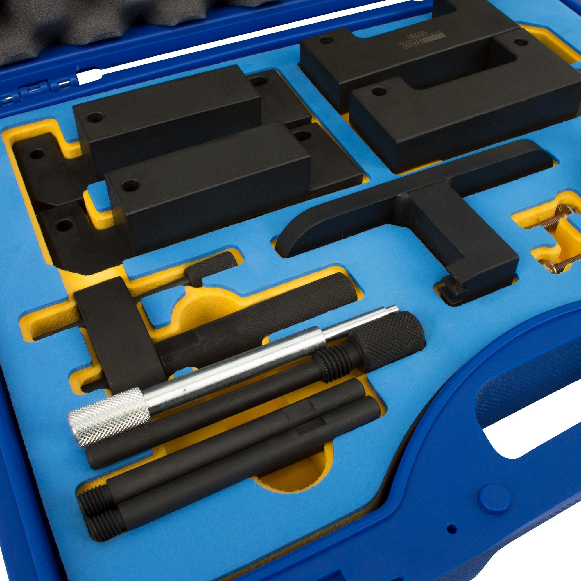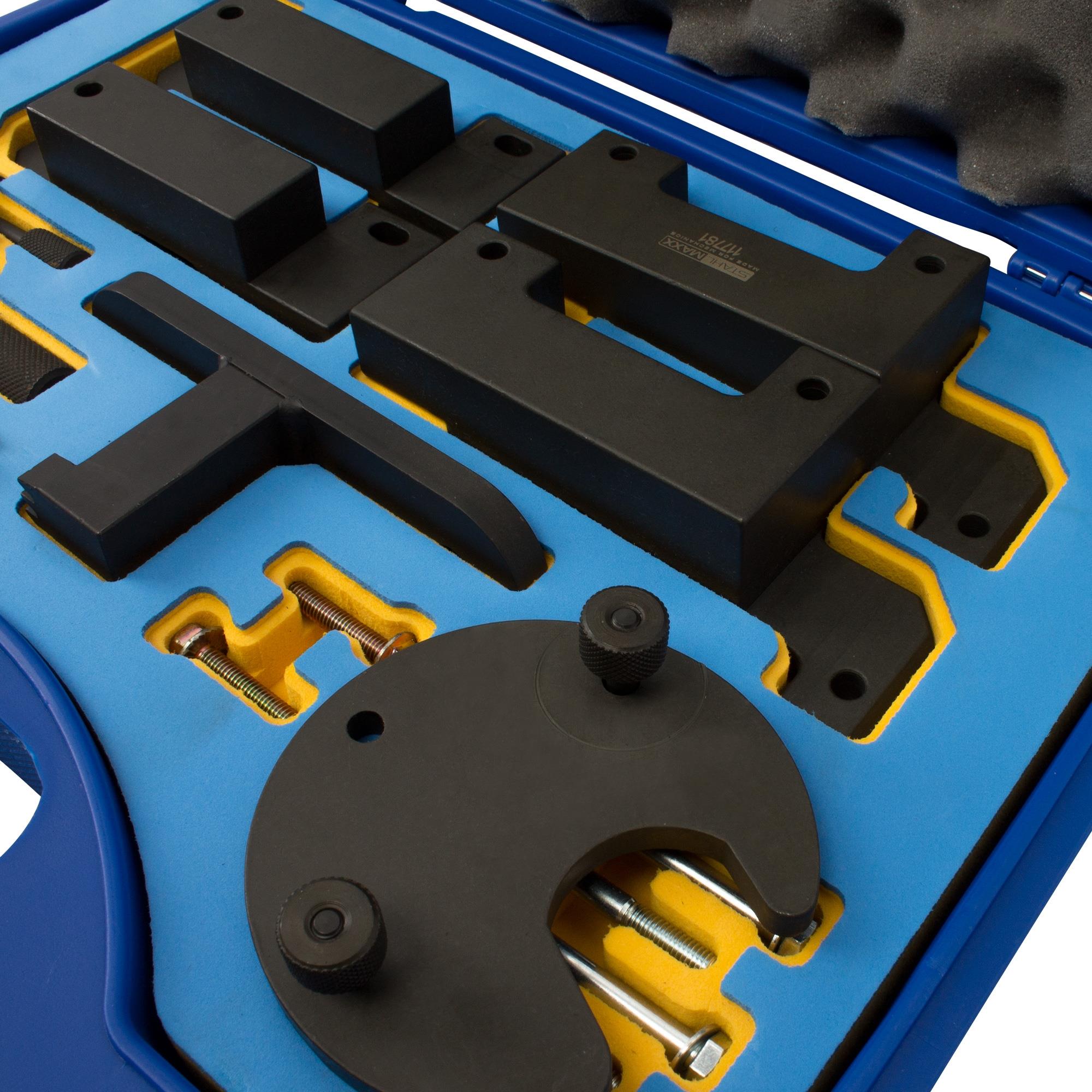 Speciale gereedschapsset voor het afstellen van de distributietiming, het reviseren van de motor en het vervangen van distributiekettingen en brandstofpompen op 4.4D / 448DT-motoren van 2011–2019.