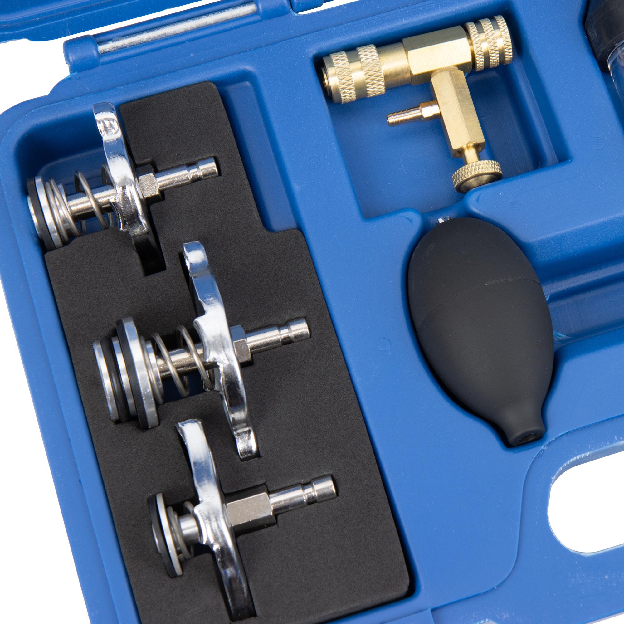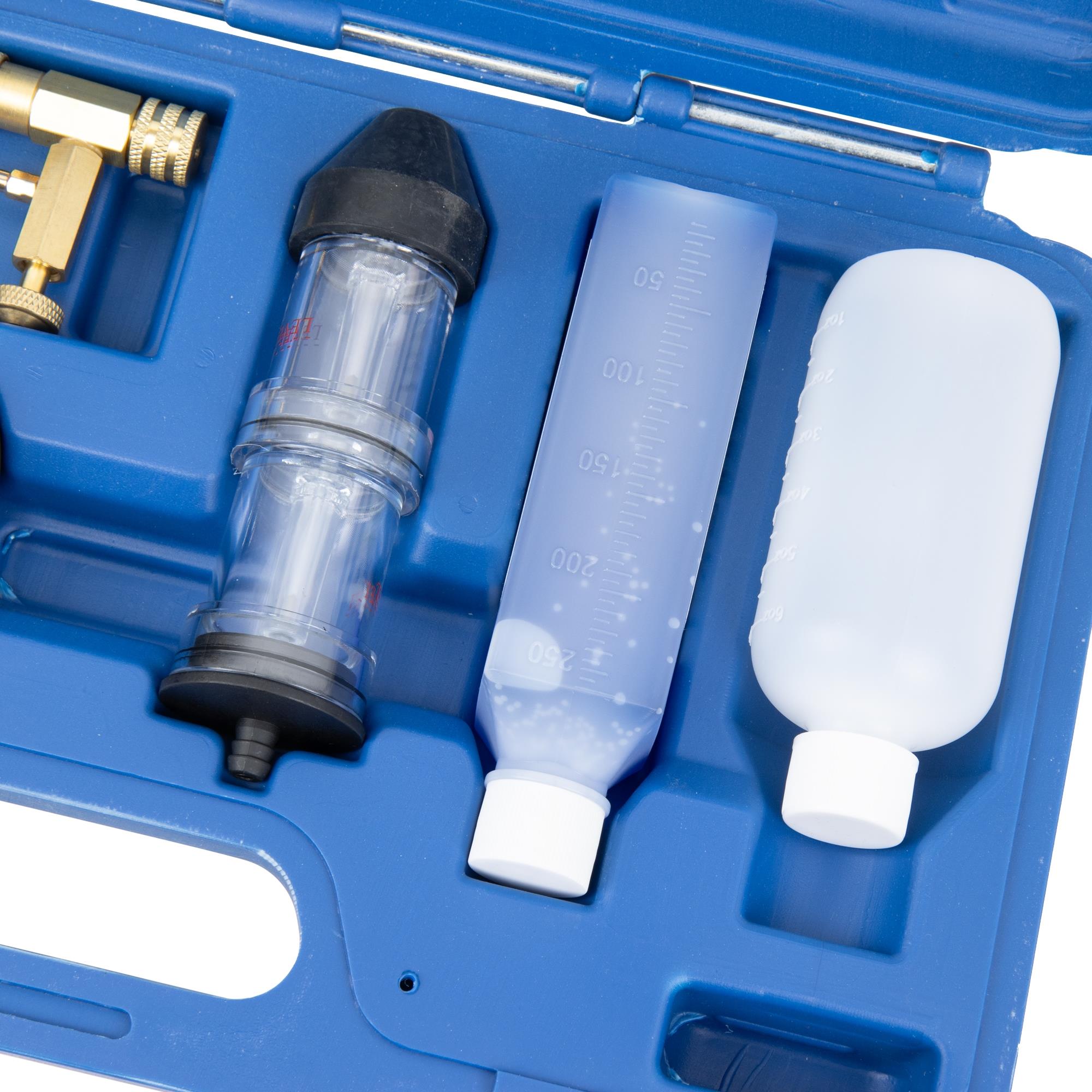 Test- en diagnoseapparaat voor het opsporen van lekkende cilinderkoppakkingen, incl. 250 ml blauwe contrastvloeistof.